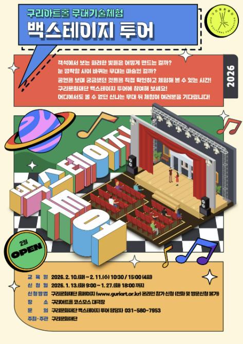 진화자 구리문화재단 대표이사는 “방학 기간 중 체험 중심의 교육을 통해 아이들이 새로운 꿈과 진로에 대한 상상을 키우고, 공연장과 문화예술에 대한 궁금증을 해소하는 계기가 되길 바란다”라며 “이번 프로그램이 문화예술에 관한 관심을 넓히는 소중한 경험이 되기를 기대한다”라고 전했다.
