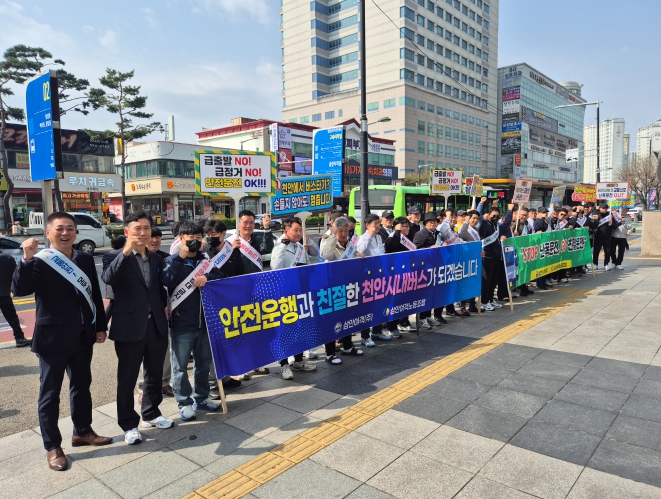 이날 캠페인에는 삼안여객 관계자와 노동조합 등 50여 명이 참여해 ‘손 들지 않아도 정류장에서 멈춥니다’, ‘안전운전 OK! 난폭운전 NO!’ 등의 메시지가 담긴 피켓을 들고 시민 중심의 친절 서비스 실천 의지를 다짐했으며, 지난해 대비 행정처분 및 민원 발생 건수 30% 감소를 약속했다.