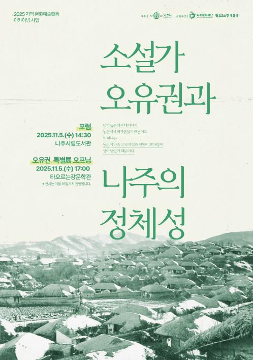 나주문화재단은 오는 11월 5일 나주시립도서관과 타오르는강문학관 일대에서 ‘소설가 오유권과 나주의 정체성’을 주제로 포럼, 전시, 문학 투어를 개최한다고 27일 밝혔다.