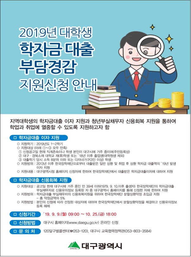 | ▲ 2019년 대학생 학자금 대출 부담경감 지원 신청 안내 포스터. (자료=대구시 제공) |