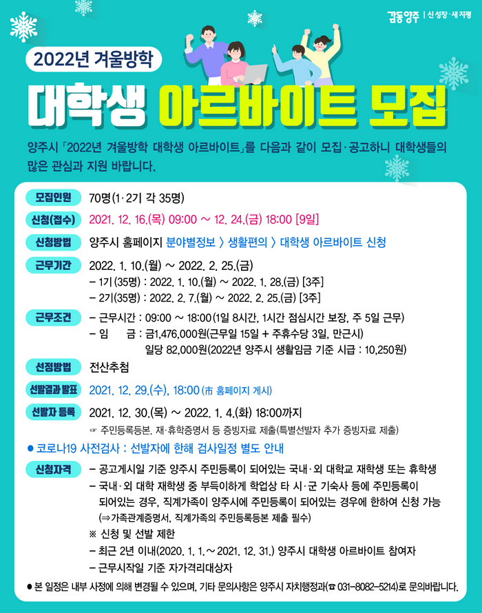 | ▲양주시는 2022년 겨울방학 대학생 아르바이트생을 모집한다고 공고했다.(사진=양주시) |
