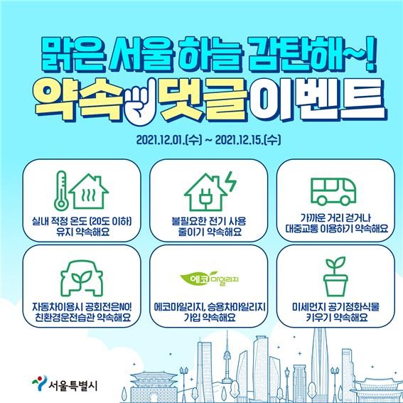 ‘맑은 서울 하늘 감탄해~!’ 실천사항은 △실내 적정온도(20℃ 이하) 유지 약속해요 △불필요한 전기사용 줄이기 약속해요 △가까운 거리는 걸어서 또는 대중교통 이용하기 약속해요 △자동차 이용시 공회전은 NO! 친환경 운전습관 약속해요 △에코마일리지, 승용차 마일리지 가입 약속해요 △미세먼지 공기정화식물 키우기 약속해요 이다.