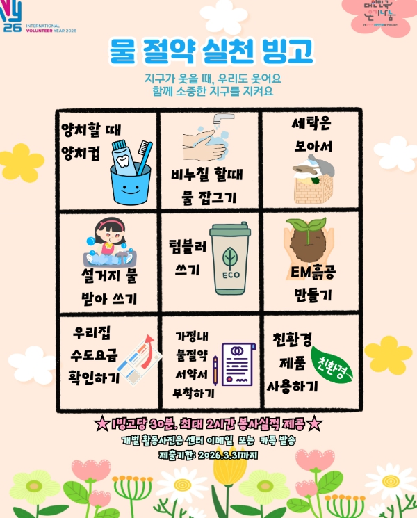 '물 절약 실천 빙고'는 일상에서 쉽게 실천할 수 있는 ▲양치 컵 사용 ▲비누칠 시 물 잠그기 ▲세탁 모아서 하기 ▲설거지 시 물 받아 사용하기 ▲텀블러 사용 ▲EM 흙 공 만들기 ▲가정 내 수도 요금 확인하기 ▲물 절약 서약서 부착 ▲친환경 제품 사용하기 등 총 9개 활동이다.