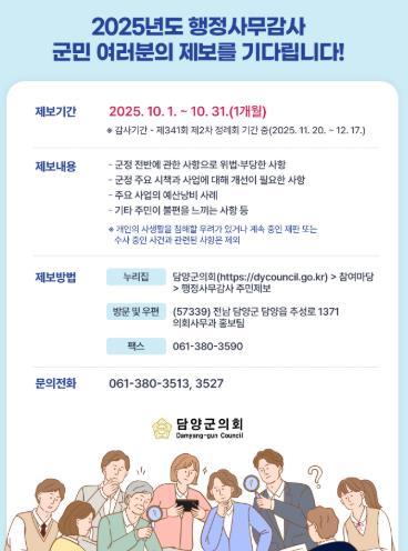 제보는 담양군의회 누리집, 이메일, 우편, 팩스 등 다양한 방법으로 제출할 수 있으며, 접수된 제보 내용은 실무 검토를 거쳐 오는 11월에 실시되는 제341회 제2차 정례회 기간 중 실시되는 행정사무감사에 적극 반영할 예정이다.