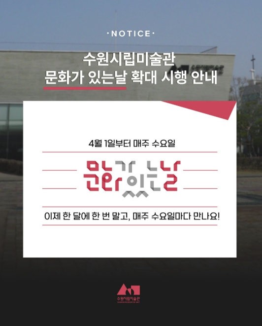 수원시립미술관 남기민 관장은 “‘문화가 있는 날’ 확대 운영을 통해 더 많은 시민이 일상 속에서 자연스럽게 미술관을 찾고, 예술과 가까워지는 계기가 되길 바란다”라고 밝혔다.