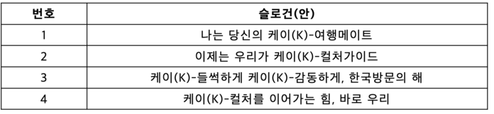 캠페인 표어(슬로건) 후보안 4개는 관광·홍보 전문가와 대학생 기자단 등 각계의 다양한 의견을 반영해 케이(K)-컬처에 대한 관심을 불러일으키며 환영 분위기가 잘 드러난 표어(슬로건)로서 적합성과 활용도 등을 기준으로 정했다.