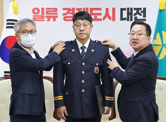 수여식은 1일 이장우 대전시장과 강영욱 자치경찰위원장, 동료 직원들이 참석한 가운데 진행됐으며, 이장우 대전시장은 경위로 승진하는 대전서부경찰서 경비교통과 교통조사팀 김치(金治) 경사에게 임명장을 수여하고 계급장을 부착했다.