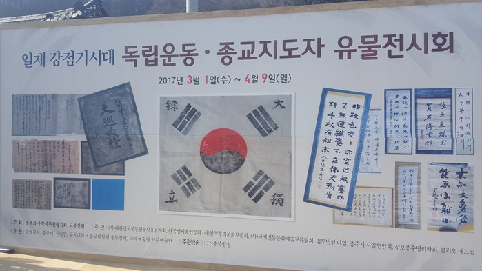 ▲ 고불선원의 독립운동 지도자 유물 전시회 알림 현수막.<사진제공=충주시청> |