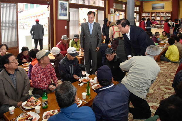 | ▲이석우 남양주시장(오른쪽)이 지난 17일 불암사에서 열린 효 잔치에 참석해 인사를 하고 있다.<사진제공=남양주시청> |