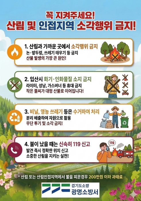 이에 따라 광명소방서는 봄철 기간 동안 산림 인접지역과 주거 밀집지역, 화재취약시설을 중심으로 예방순찰과 안전지도를 강화하고, 시민 대상 화재예방 홍보를 집중 추진할 방침이다. 특히 산림 및 인접지역 소각행위 금지, 담배꽁초 무단 투기 금지, 쓰레기 소각 금지 등 부주의 화재예방 수칙을 적극 안내할 예정이다.