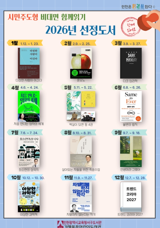 월별 도서 목록은 ▲1월 '다정한 사람이 이긴다' ▲2월 '혼모노' ▲3월 '다크 심리학' ▲4월 '처음 만나는 양자의 세계' ▲5월 '백 살이 되면' 등 4권 ▲6월 '불변의 법칙' ▲7월 '최소한의 삼국지' ▲8월 '살아있는 자들을 위한 죽음 수업' ▲9월 '안녕이라 그랬어' ▲10월 '이상한 과학책' ▲11월 '차별하지 않는다는 착각' ▲12월 '트렌드 코리아 2027'이다.