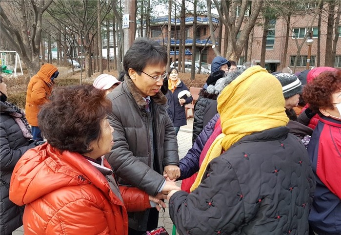 | ▲ 김광수 서울시의원이 지난 10일 서울 당고대공원에서 설 맞이 떡국떡 나눔행사에 모인 어르신들과 인사를 나누고 있는 모습. <사진제공=김광수 의원실> |