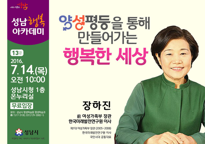[세계로컬신문 온라인뉴스팀] 경기도 성남시(시장 이재명)는 양성평등주간을 맞아 여성가족부장관을 역임한 장하진 한국미래발전연구원 이사를 초빙해 오는 14일 성남행복아카데미 13강을 연다고 8일 밝혔다.