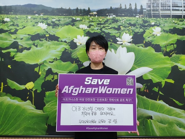 [세계로컬타임즈 박종현 기자] 무안교육지원청 김란 교육장은 최근 ‘아프가니스탄 여성의 가슴에 ‘희망의 꽃’을 심어주세요.’라는 손글씨가 적힌 팻말을 들고 ‘세이브 아프간 위민(Save Afghan Women)’ 챌린지에 동참했다.