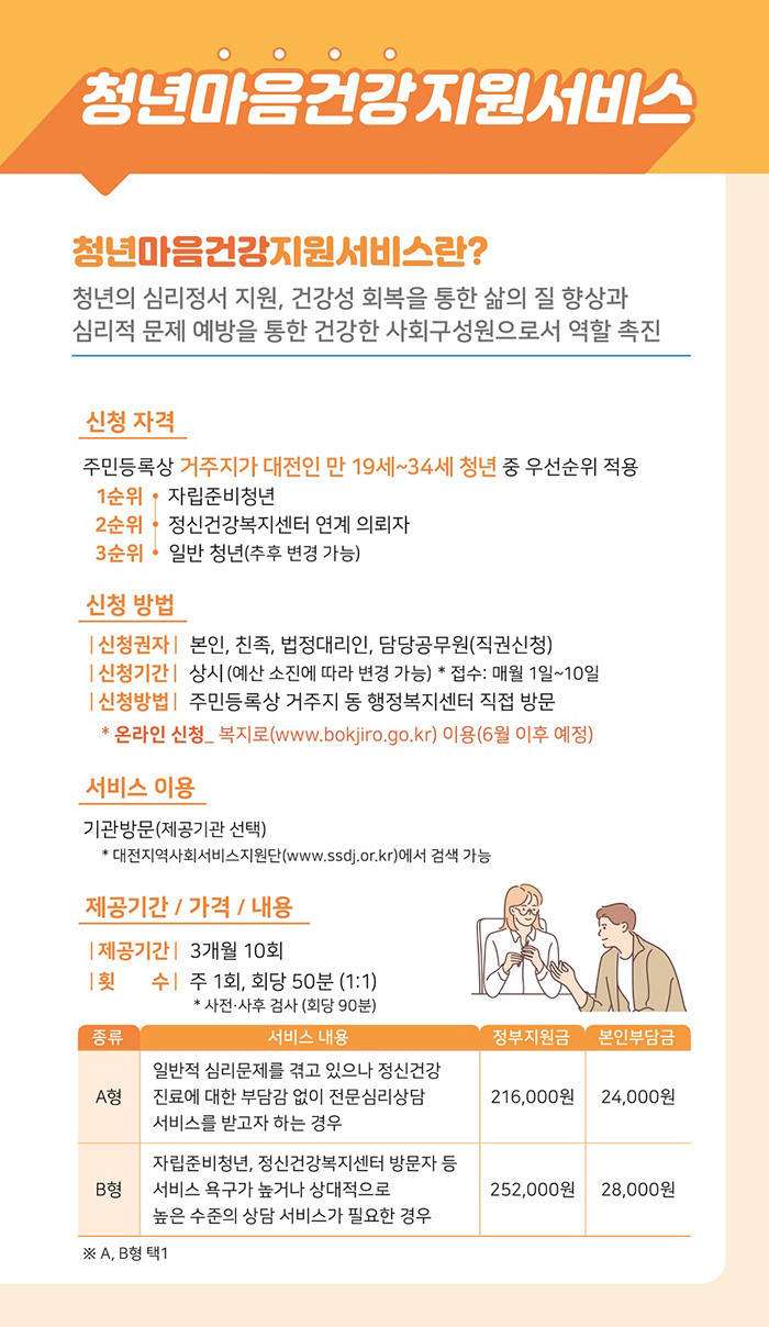 [세계로컬타임즈 민순혜 기자] 대전시는 지역사회서비스 투자사업의 일환으로 청년들에게 전문적이고 체계화된 심리상담 서비스를 제공하는‘청년마음건강지원서비스’와 ‘청년신체건강증진서비스’ 이용자를 모집한다고 밝혔다.