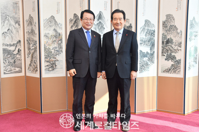 | ▲정세균(오른쪽) 총리와 정헌율 익산시장이 지난 12일 면담에서 기념촬영을 하고 있다. (사진=익산시 제공) |