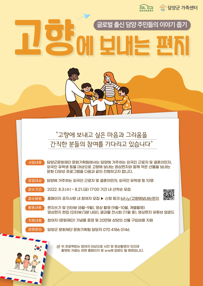 [세계로컬타임즈 이남규 기자] 담양군문화재단은 담양에 거주하는 외국인 근로자, 결혼 이민자, 외국인 유학생 등 외국인을 대상으로 ‘고향에 보내는 편지’ 프로젝트를 추진한다.