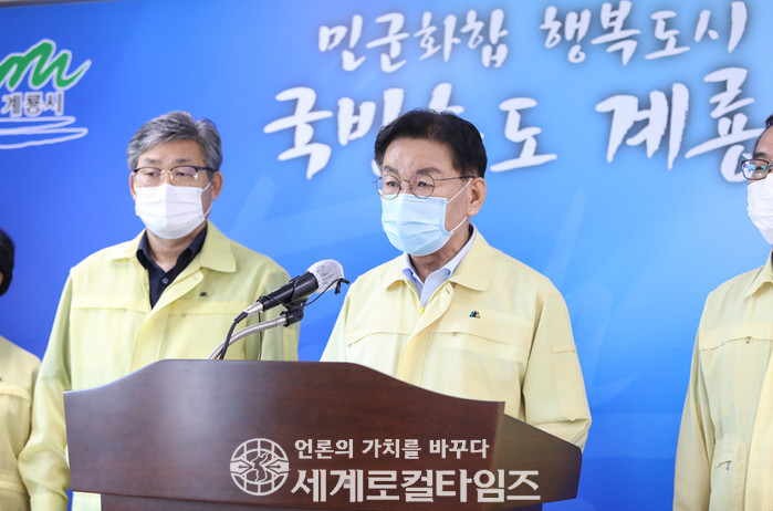 | ▲ 16일 오후 최홍묵 계룡시장이 브리핑을 하고 있다(사진=계룡시 제공) |