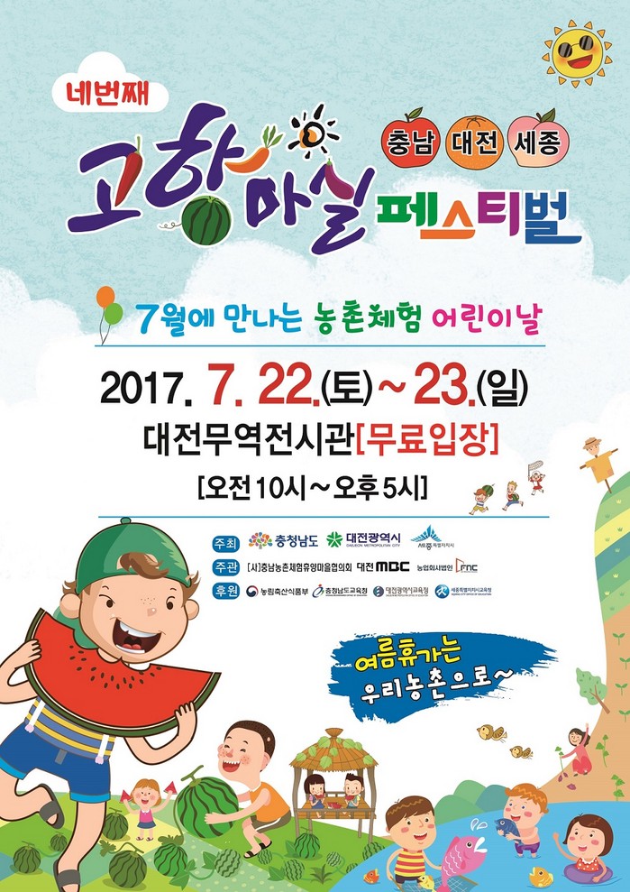 이번 행사에는 공동체험관, 체험마을관, 로컬푸드관, 6차산업 홍보관이 운영되며 도심에서 농촌을 직접 체험할 수 있도록 ‘여름휴가는 농촌으로’, ‘1개 마을 세친구 만들기’라는 주제로 다양한 농촌체험 행사가 진행된다.