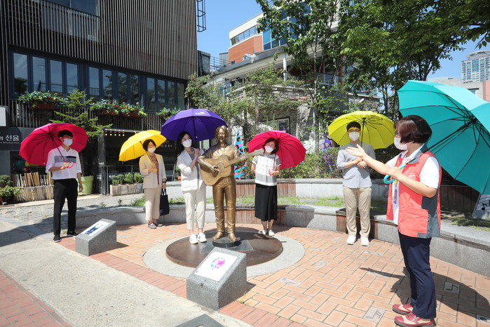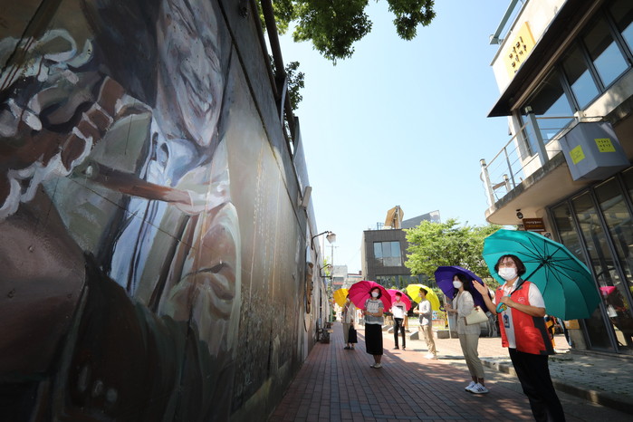 | ▲ 투어 참가자들이 ‘투어 속 거리두기 양산’을 쓰고 김광석 거리에서 벽화를 보며 설명을 듣고 있다.(사진=중구 제공) |