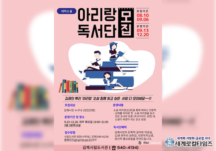 김제시 관계자는 “아리랑 12권을 석 달여 기간 동안 함께 모여 책 읽기와 토론, 역사적인 현장 탐방을 통해 김제의 역사를 바로 알고 김제시민의 민족적 긍지와 자긍심을 고취하는 계기가 될 것으로 사료 된다”고 전했다.