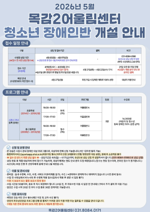 프로그램 접수는 4월 18일 6시부터 4월 20일 21시까지 현장 접수를 진행하고, 4월 21일 당첨자에게 개별 안내할 예정이다. 궁금한 사항은 목감2어울림센터로 문의하면 된다.