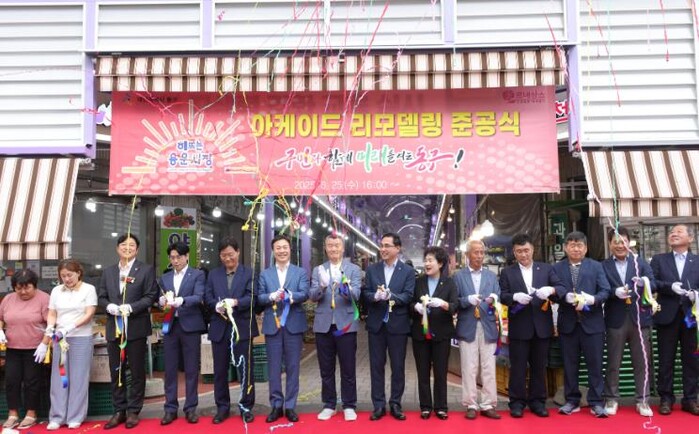 이번 사업은 총사업비 11억 3,700만 원을 투입해 2024년 10월 말 착공, 2025년 5월 말에 완료됐으며, 기존 아케이드를 유지하면서 지붕재 전면 교체, 철골 구조물 도색 및 보강 등 리모델링을 실시하고, 간판과 안심판매대를 통일감 있게 정비해 시장의 미관과 안전성을 강화했다.