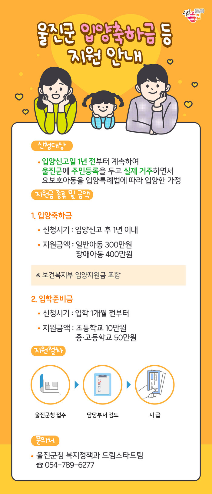 지원대상은 입양 신고일 1년 전부터 계속해 울진군에 주민등록을 두고 실제 거주하면서 아동을 입양한 가정이고, 입양신고 후 1년 이내 또는 입학 1개월 전에 신청서를 거주 읍·면이나 울진군 담당부서에 제출하면 된다.