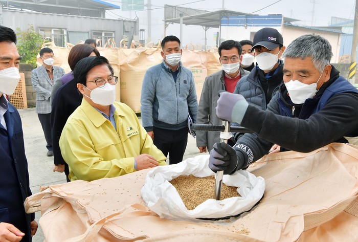 | ▲ 장성군 벼 수매현장에 참관한 유두석 장성군수 (사진=장성군) |