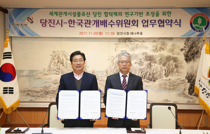 당진시에 따르면 20일 시와 한국관개배수위원회가 당진시청 해나루홀에서 김홍장 시장과 이봉훈 회장이 참석한 가운데 합덕제 연구기반 조성을 위한 업무협약을 맺었다.
