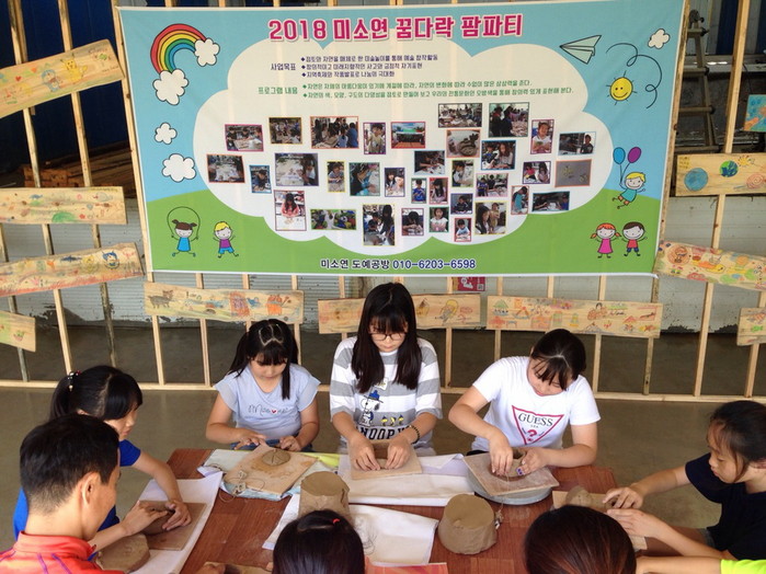 | ▲ 2018 미소연 꿈다락 팜파티 참여한 가족들이 점토로 공예작품을 만드는 모습. |