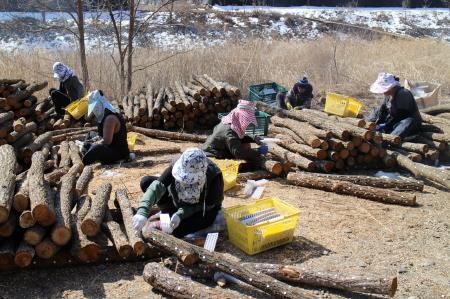 이 지역에서는 대부분의 표고재배 농가들이 지난 20일경부터 참나무 원목을 길이 1.2m 크기로 자른 뒤 구멍을 파고 종균을 접종하고 있다.