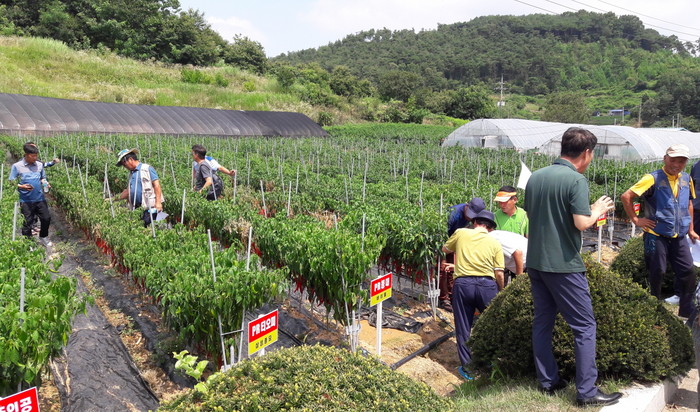| ▲ 26일 면천지역 고추 재배 환경에 적합한 품종 도입을 위해 청양군에 위치한 고추재배단지를 견학하는 모습. |