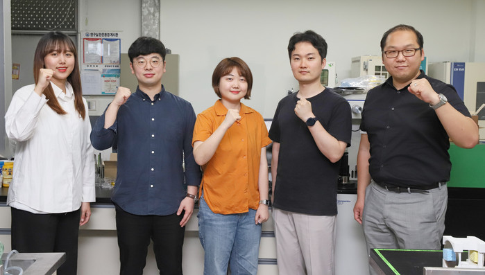 | ▲ 미국 공군연구소와 공동연구를 진행하는 인하대 고분자공학과 (왼쪽부터)장새봄, 이재경, 박정은, 전지수 학생과 위정재 교수가 의지를 다지고 있다. (사진=인하대 제공) |