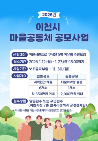 [세계로컬타임즈] 이천시는 주민이 직접 제안하고 실행하는 공동체 활동을 지원하기 위해 ‘2026년 이천시 마을공동체 공모사업’ 참여 공동체를 모집한다고 밝혔다.
