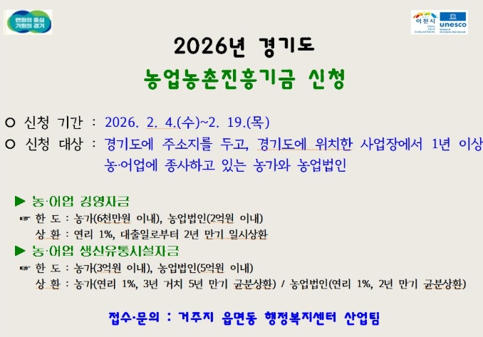 이천시 관계자는 “농업농촌진흥기금의 경우 사업 대상자로 선정됐더라도 개인의 신용, 담보 능력에 따라 융자가 되지 않는 경우가 있다”라며, 신청 전 NH농협 이천시지부를 방문하여 은행을 통해 ‘농업농촌진흥기금 사전 신용조사서’를 발급받아야 사업을 신청할 수 있다”라고 말했다.