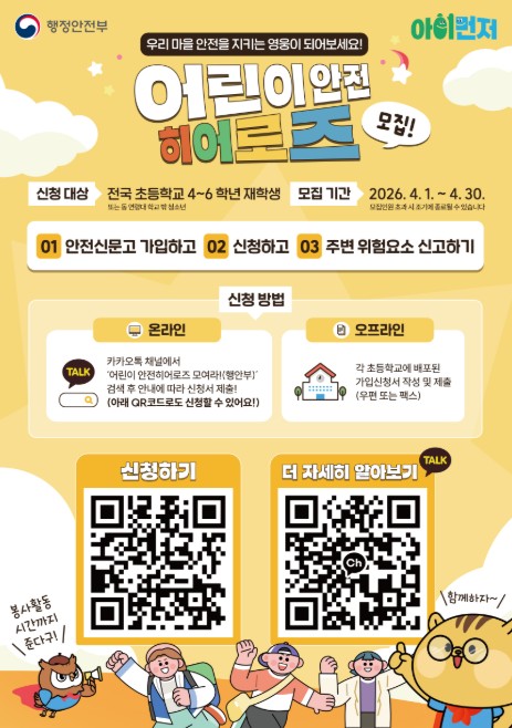 박형배 안전예방정책실장은 “어린이들이 자발적으로 안전신고 활동에 참여하는 어린이 안전히어로즈는 생명존중 안전사회를 여는 미래 안전 대한민국의 주인공이 될 것”이라며, “어린이 안전히어로즈 모집에 어린이와 보호자 여러분의 많은 관심과 참여를 부탁드린다”라고 말했다.
