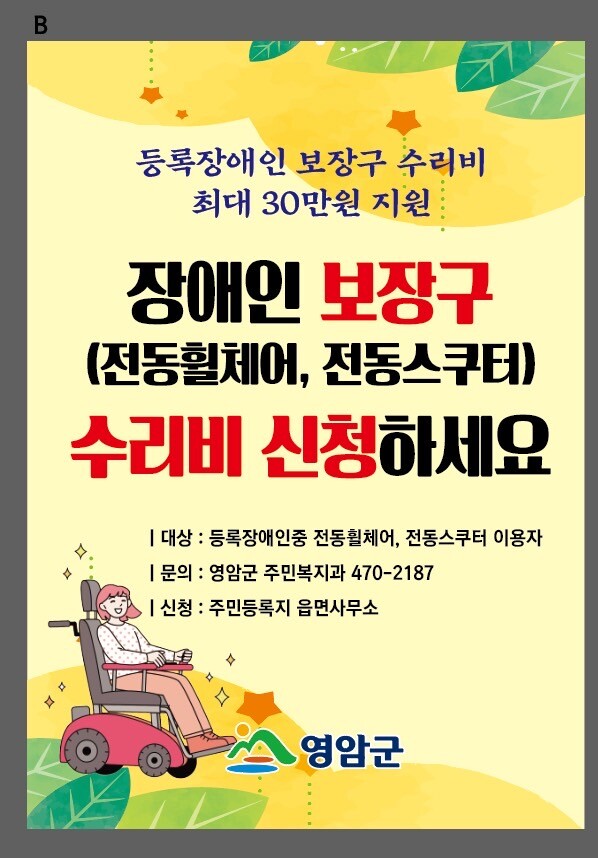 [세계로컬타임즈 강석운 기자] 영암군이 장애인 지원시책으로 장애인보장구(전동휠체어·스쿠터) 수리비 지원사업을 추진한다.