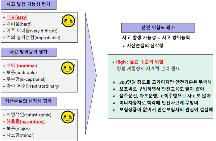 안전 위험도 평가 전동스쿠터의 안전을 종합적으로 고가에도 불구하고 미흡한 품질안전 기준, 음주운전 등 안전사고 가능성 증가, 고령과 장애 등으로 방어능력 취약 등을 감안하면 위험한 수준이라는 것을 알 수 있다.