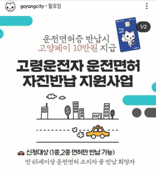 고양시는, 지난 8월까지 운전면허를 반납한 고령운전자 2,500여 명에게 고양페이 10만 원 선불권을 등기우편으로 발송해 인센티브 지급을 마무리했다. 또 9월 반납자 391명에게는 예정대로 10월 20일이후 인센티브를 지급할 예정이다.