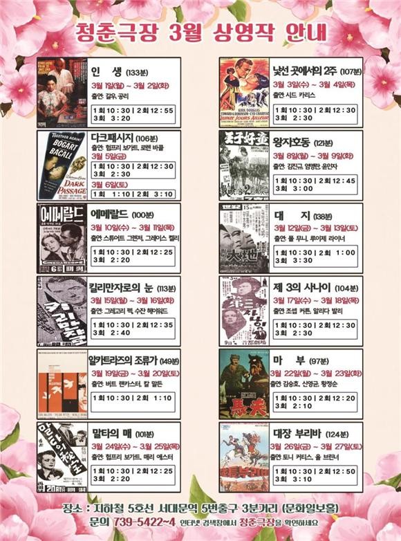 또한 청춘극장은 코로나19로 안전한 문화 관람을 원하는 관객을 위해 온라인으로 고전영화를 관람할 수 있는 ‘청춘안방극장’을 운영 중이다.