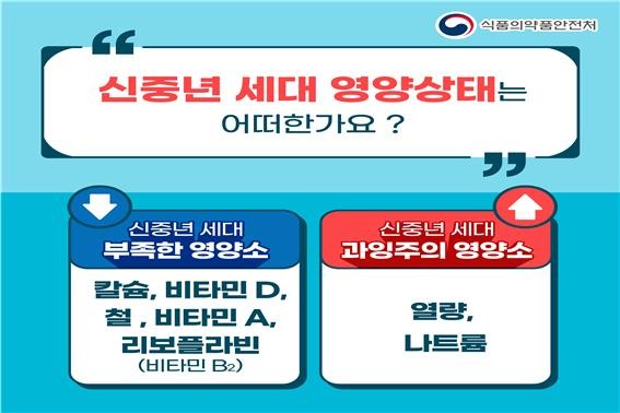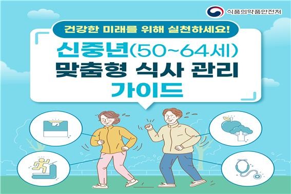 [세계로컬타임즈 이효진 기자] 식품의약품안전처는 신체적‧정서적 큰 변화를 겪는 신중년(50~64세)을 대상으로 만성질환 예방 및 관리, 뼈‧근육 강화 등을 위한 맞춤형 식사관리 안내서를 제작‧배포한다.