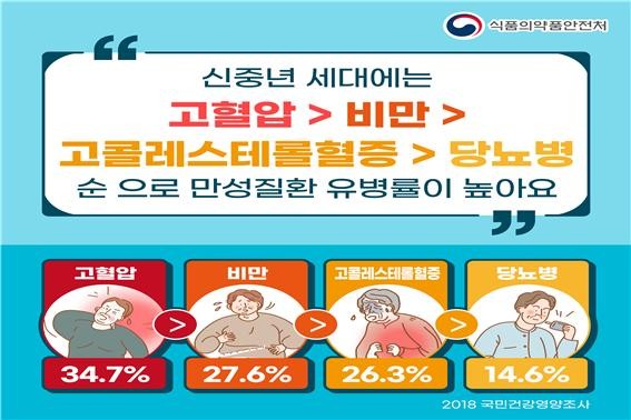 최근 한국인 건강상태 분석에 따르면 신중년기에 높은 유병율을 보이는 만성질환은 고혈압>비만>이상지질혈증>당뇨병 순이다.