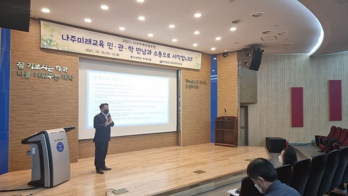 [세계로컬타임즈 강석운 기자] 나주교육지원청(교육장 박윤자)은 15일 동신대학교 투게더홀에서 학부모, 교직원, 나주교육참여위원 등 80여명이 참석한 가운데 '나주미래교육 민・관・학 만남과 소통으로 시작합니다'라는 주제로 '2021 나주미래교육포럼'을 개최했다.