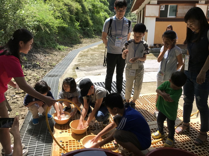 | ▲ 농업테마공원에서 열린 '이천쌀문화학교'에 참가한 아이들이 쌀에 대한 설명을 들으며 직접 쌀을 씻고 있는 모습. <사진제공=이천시청> |