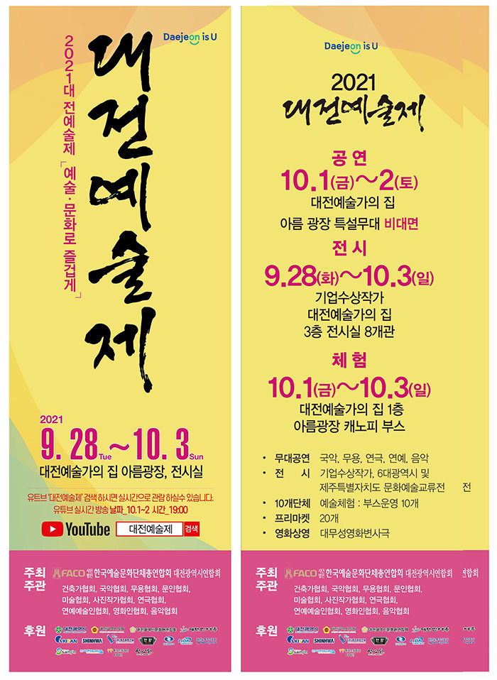 대전시 관계자는 “2021년 대전예술제는 우리시를 대표하는 문화예술 행사로 올해는 안타깝게도 라인 및 대면행사를 함께 개최하게 됐다”며 “대면행사에 참여 하지 못한 시민들은 유튜브 ‘대전예술제’에 접속해 다소나마 힘든 상황을 가을 낭만과 여유를 즐길 수 있는 기회가 됐으면 좋겠다”고 덧붙였다.