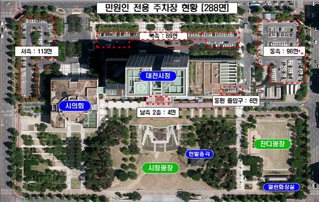 25일 대전시에 따르면 주차장 운영 개선안은 시청사 부설 지상 주차장 288면 전체를 민원인 전용구역으로 지정하고 그동안 5부 제로 운영되던 직원들의 차량 출입 방식을 2부 제로 강화하는 내용이다.