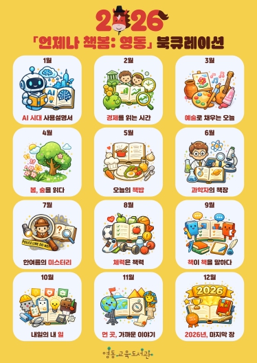 2026년 월별 운영 주제는 ▲1월 AI 시대 사용설명서 ▲2월 경제를 읽는 시간 ▲3월 예술로 채우는 오늘 ▲4월 봄, 숲을 읽다 ▲5월 오늘의 책밥 ▲6월 과학자의 책장 ▲7월 한여름의 미스터리 ▲8월 체력은 책력 ▲9월 책이 책을 말하다 ▲10월 내일의 내 일 ▲11월 먼 곳, 가까운 이야기 ▲12월 2026년, 마지막 장이다.