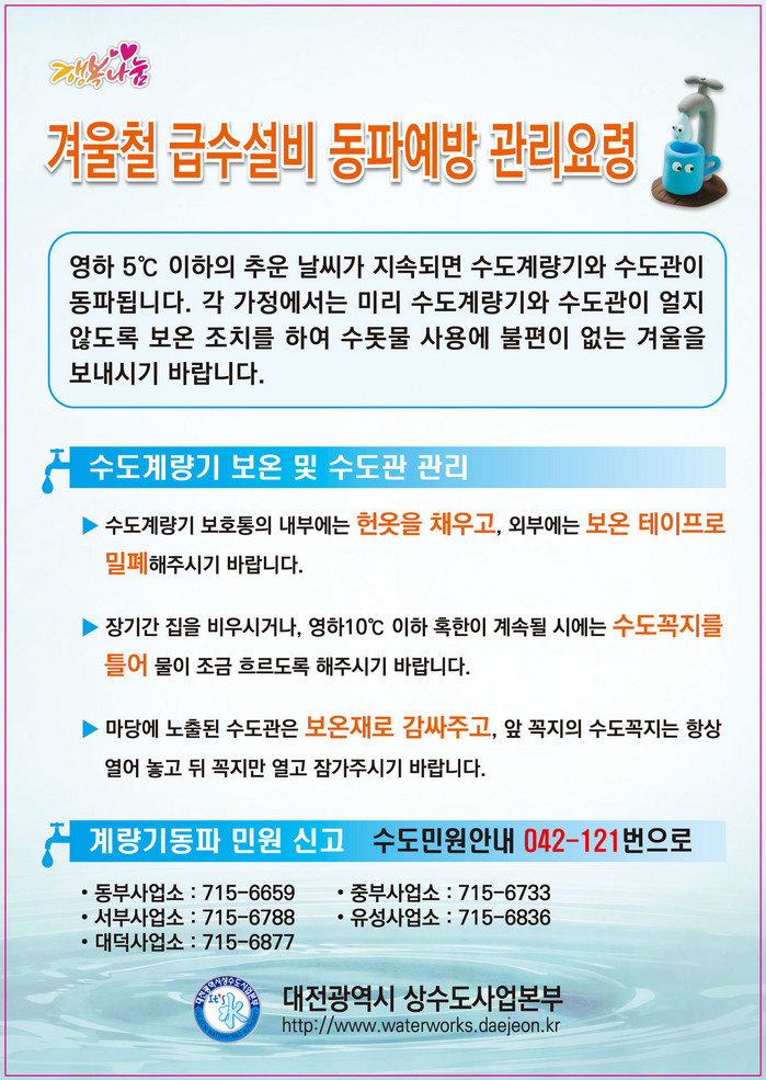 상수도사업본부는 동파 예방을 위한 계량기 보온조치 및 대처법 등을 시민들이 쉽게 이해할 수 있도록 전단지 등을 통해 홍보하고 한파가 예보되면 TV자막을 통한 동파예보제를 실시한다.
