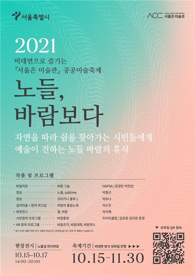 [세계로컬타임즈 이효진 기자] 서울시는 모바일로 손쉽게 즐길 수 있는 ‘서울은 미술관’ 공공미술축제‘노들, 바람보다’를 15일부터 11월 30일까지 진행한다.